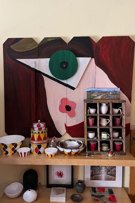 A painting by Candi on a cabinet door (left) and a Wright-style table of interlocking squares, designed by Mark. Adriane Quinlan .