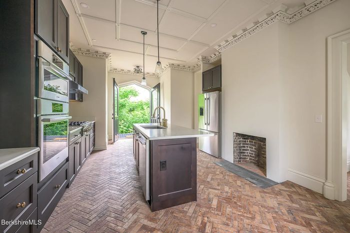 As seen in this listing photo, this 19th-century Italianate has been restored and is filled with delightful details including herringbone floors and crown molding.
