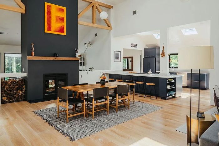 A relatively new-build brick home with strong modern-farmhouse energy. This four-bedroom has an airy, double-height main space anchored by a double-sided fireplace that splits the dining and sunken sitting areas. It’s not exactly clear what’s going on with the oak beam trusses flanking the fireplace that, per the listing, “add warmth and character,” but we appreciate the skylights that bathe the chef’s kitchen in great light. The abundance of oversize windows scattered throughout will make you feel like you’ve been thrust right into the woodlands surrounding you, but with the creature comforts of central air and geothermal heating. In the main bedroom, the floor-to-ceiling picture window is an especially nice touch. The property also has a separate lofted apartment with its own kitchen and private entrance, so I’m guessing we’ll see it on Airbnb soon.
