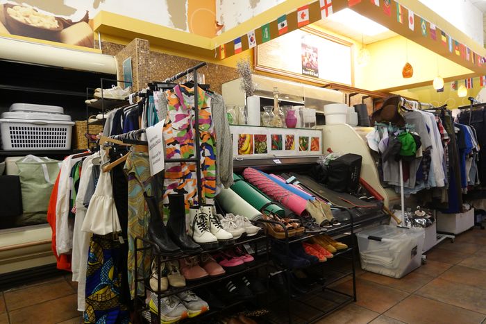 The store itself is being temporarily recycled. The old grocery store on the ground floor of 111-113 Second Avenue was donated, rent-free, by NYU, which owns the building, a former concert hall that became the original Tisch School of the Arts and now holds dance classrooms upstairs. A 38,000-square-foot space on the ground floor has been leased to a rotating cast of grocery stores since 1974: an Associated, then a Met Food, then a co-op, then the independently owned New Yorkers Food Market, whose owner closed it down in 2023 after losing too much business to the new Wegmans on Astor Place. That grocery left behind the shelving and aisles that a swap shop might need — but they were covered in dust when Misty Germany, an NYU facilities employee, arrived to clear out the space in May. “It was a dust bowl,” she joked. The dust is now clear, but the old grocery-aisle signs are still up. A cash register, now useless, has been pushed to the side.