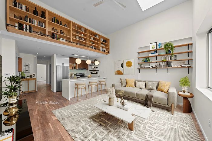 Can an apartment have too many skylights? In addition to one in each of its two bedrooms, this Boerum Hill condo has another two in the living room (along with 13-foot ceilings). The windows themselves also are south facing, so this is a Good Light apartment. The open-concept kitchen is anchored around a waterfall island and has stainless-steel appliances, including a dishwasher. (While we’re on appliances, the apartment also has in-unit laundry.) A roof hatch in the second bedroom leads to a private little roof deck, too. The combined taxes and common charges pencil out to $2,151 a month, which gets you a video intercom, live-in super, and a basement-level storage closet.