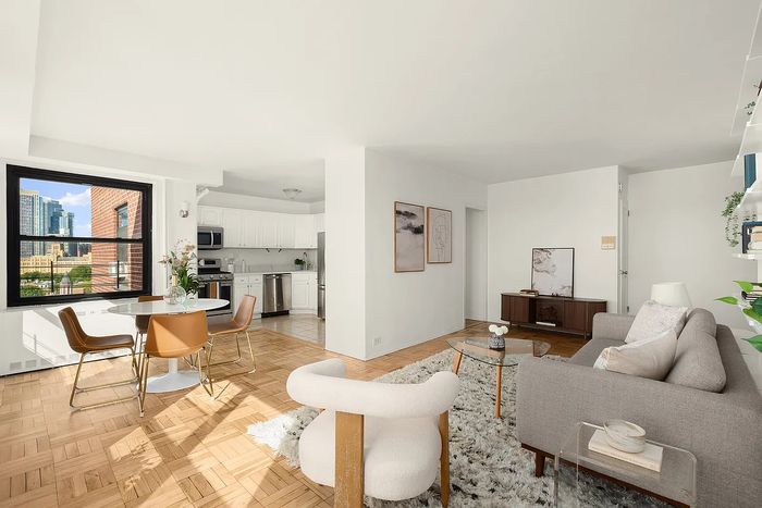 This Clinton Hill Co-ops’ north-campus penthouse unit is an unusual room-within-a-room layout that has emboldened the sellers to list what is basically a one-bedroom with a very large walk-in closet as a two-bedroom. Still, we’re into it. It’s a corner unit, with many oversized windows and a nicely sized living-dining area with views of the Brooklyn skyline. The kitchen is also spacious and appealing, though the floors could use a refresh. (The refinished parquets throughout the rest of the apartment, though, are lovely.) The building is pet-friendly and comes with a landscaped courtyard. As for the monthlies, it’s $1,360 for a full-time staff (including a live-in super), shared laundry and bike storage, and you’re right down the block from Fort Greene Park and less than a ten-minute walk from the G train station.