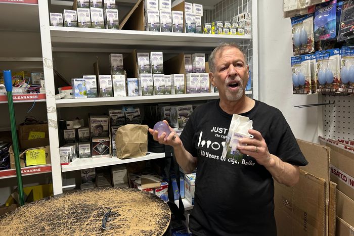 Just Bulbs, a small shop on East 58th Street with lightbulbs glowing warmly in the front window, sells exactly what the name suggests. You can buy a tiny bulb for a microscope, a smart bulb that’s compatible with your smart-home devices, or a set of colored bulbs for a party. There are old-fashioned Edisons and the tubular bulbs for hospital cafeterias and other places with unpleasant overheads. Just Bulbs is a long-running family operation (it first opened in Chelsea in 1980 before moving to East 58th), and Brooks is a third-generation lightbulb seller, but the shop has taken on new significance in the LED era. After more than 20 years of their slowly being phased out, the sale of most incandescent, halogen, and fluorescent bulbs was banned in the United States in 2023. As more and more of people’s go-to bulbs disappeared from the market, Brooks and his employees got better and better at figuring out approximations of the banned bulbs people were looking for — until those approximations were also banned. Today, he says, LED technology has gotten much better — “You can get LED lights now in eight different shades of white, so you can’t hate them all!” — but a certain set of people still refuse to switch their bulb allegiances. They can’t stand the new light and are desperate to buy old bulbs, even as they’ve become harder to find.