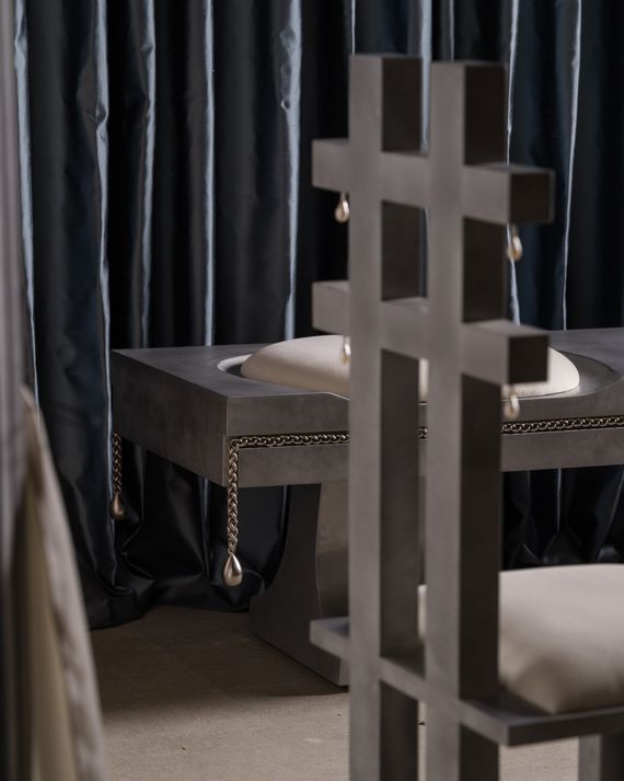 For the designer, the metal adornments are the central feature of the collection. “They also reference the ancient tradition of bell-making, where skilled artisans would pour molten metal into molds to create resonant, enduring shapes,” Goti said. In this case, the ornamental elements are vital: They hold up the various furnishings and allow them to function.