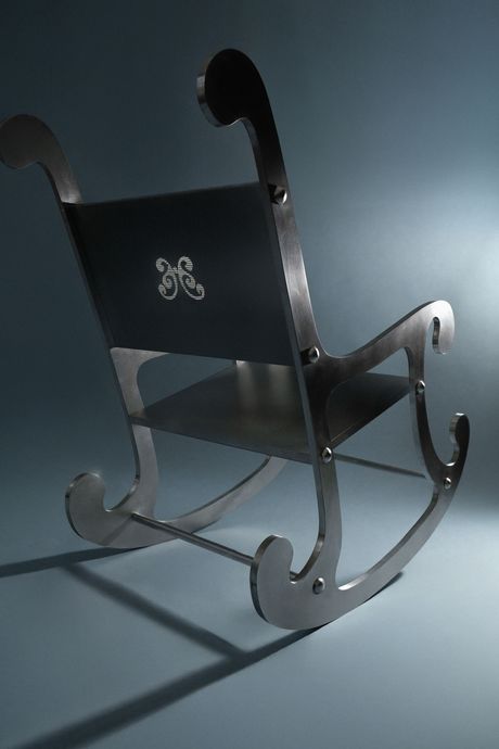 The chair, constructed of brushed and waxed aluminum, has eight low-relief inserts in oak and terra-cotta embedded into the extruded pieces that make up the seat. These embellishments were carved or molded to reflect artisanal motifs once popular in the south of France, with imagery like olive branches, lavender flowers, grapes, and cicadas. For Cambier, who often leans minimalist in his geometric furniture compositions, the reliefs represent a new, more nostalgic direction.