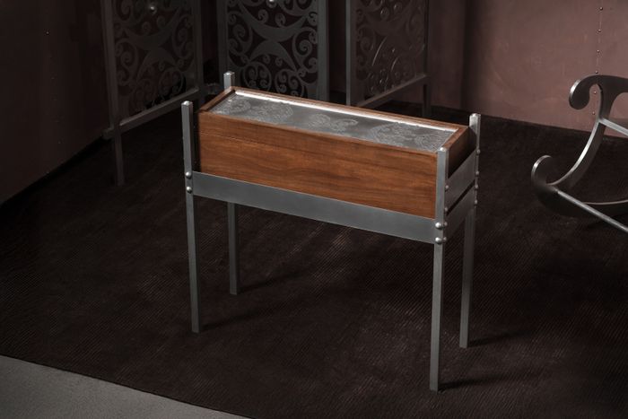 Mexico City–based designer María Laura Camejo’s latest Inventario collection — presented at Collectible by New York curatorial studio Concordia — resurfaces memories that she’s carried from her childhood in Venezuela. The rocking chair and room divider are reimagined forms of domestic objects Camejo had in her childhood home. She embellished hers with distilled interpretations of the decorative motifs she saw in those childhood pieces, which make the aluminum look like lace. Layered with Tzalam (also known as Caribbean walnut) and aluminum, the Baúl trunk features an abstracted floral pattern anchored by a grid that cuts away in sections to reveal what’s inside.
