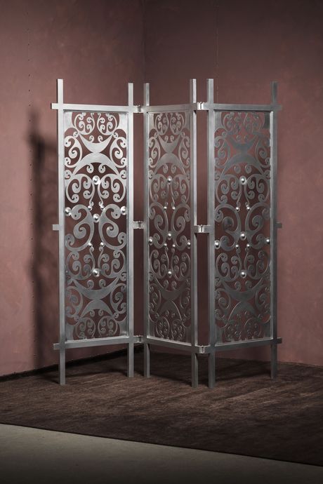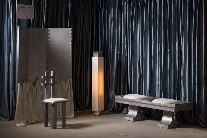 One of the strongest examples of this new trend is French designer Llewellyn Chupin’s Ritual of Adornment collection, which offered a strong contrast between the blocky furniture silhouettes and the delicate ornamentation festooning them. The chair, lamp, and bench — produced in sheets of hand-patinated aluminum — are laden with jewel-like flourishes, like the natural pearl earrings dangling off an otherwise angular chair. The free-standing screen, incorporating three perforated aluminum panels, is perhaps the most lavishly decorated with a silk drape billowing out of its lower half and held in place by knobs and carefully tied ribbons. On the bench, a platinum-plated chain is stitched into a groove that meets its exact dimensions and then hangs off the ends of the seat — a goth necklace softening the appearance of the thick slab of aluminum it’s embedded in. The design feels both contemporary and old-world, like something one might find in a well-worn, industrial loft.