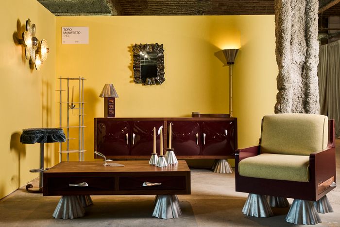 “’Bells and whistles’ refers to nonessential features, visual or functional, that are an enhancement to an object,” says New York–based Greek designer Kiki Goti. Her collection of the same name, exhibited by Mexico City gallery TORO Manifesto, consists of an armchair, sconce, table lamp, coffee table, and credenza crafted using walnut and lacquered wood along with a surprising flourish: fluted cast-aluminum forms that make up the hardware and legs.