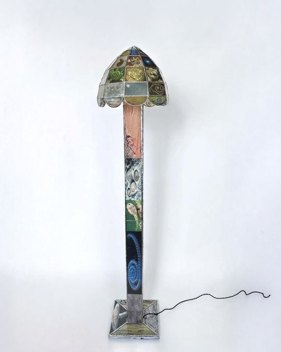 Presented as part of curator duo Natalie Kovacs and Ashlee Harrison’s Alchemists showcase at Collectible, Grace Horan’s Spiral Neo Wave standing lamp juxtaposes age-old stained-glass craft with contemporary image culture. With a classical pointed-dome shade and a rectangular stand, the light is adorned in leaded-glass panels printed with inkjet images held in place with hand-soldered metal frames. Riffing on a Tiffany lamp, photos of natural spiral formations replace the traditional planes of monochromatic color normally found in these vintage designs.