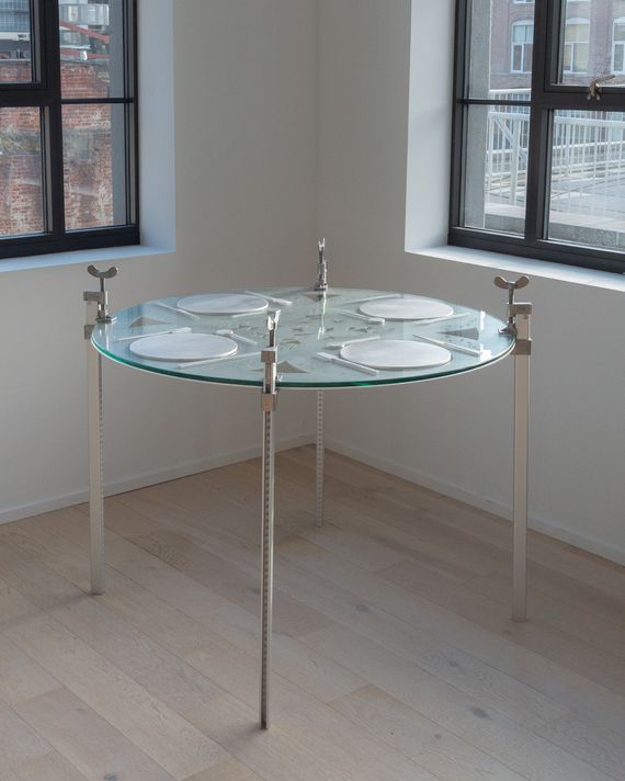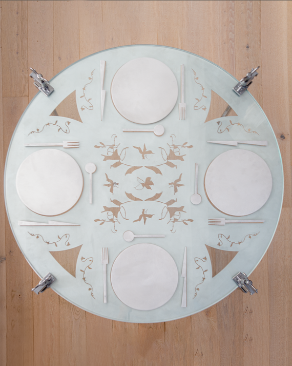 Until now, few designers have thought of making the tablecloth a structural component of their dining table. Then there’s New York–based Italian architect Francesco Rosati’s “Idea for a Table,” presented by itinerant gallery Playinghouse. Fused within two circular panes of glass, an aluminum sheet is made delicate with cut-out floral motifs in the center, while plates and cutlery cut out of the sheet are layered on top of the glass, fitting perfectly over their own outlines. The whole composition is held in place by industrial metal clamps and perforated profile legs, a stark contrast to the more delicate cut pieces.