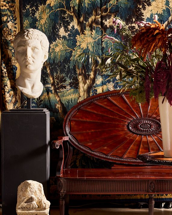 A mahogany hall bench from Britain, a bust of Emperor Galba, and an Aubusson Verdure tapestry.