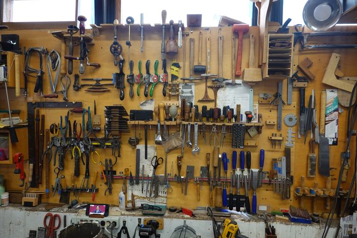 Tools and scraps of rare wood in the workshop. Adriane Quinlan.