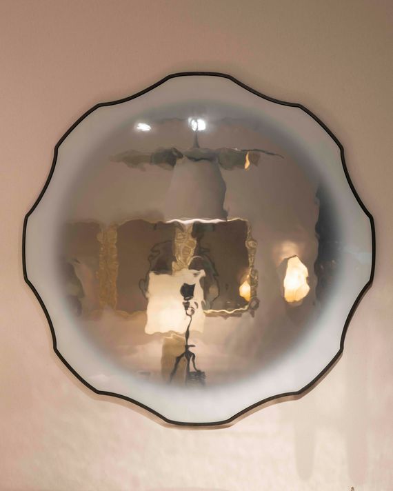 French designer duo Nicolas and Sébastien Reese’s Acamas mirror is half painting, half reflective surface. Enclosed by a notched, circular aluminum frame, the main mirror is an uneven surface of blurry, scratched, and cloudy glass with a halo of increasingly opaque oxidation along its rim. Similar to Voukenas Petrides’s Split Tube Chair, the design’s reflectivity is warped. Objects appear to get lost in the frame like ghostly figures.