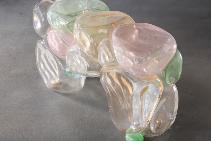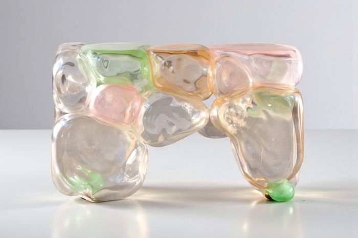 Henry Baumann’s Excessive Boo bench, presented by Philadelphia-based Wexler Gallery, looks like a bunch of colorful balloons pushed together and squeezed into a rectilinear form. These bubbling elements are, in fact, made out of semi-translucent, shiny resin that, combined together, look iridescent and still fluid.