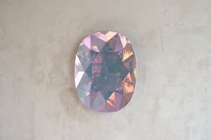 Sam Orlando Miller’s Cielo Nuovo Iris is made up of faceted dichroic glass, giving it the look of a colorful mirrored gemstone on the wall. To create the effect, thin layers of metal oxide are applied to refract light when the piece is viewed from different angles, a technique often used in the optical industry. The British artist also applied an additional layer of paint to further diffuse the light. The piece was presented by London-based Gallery FUMI.