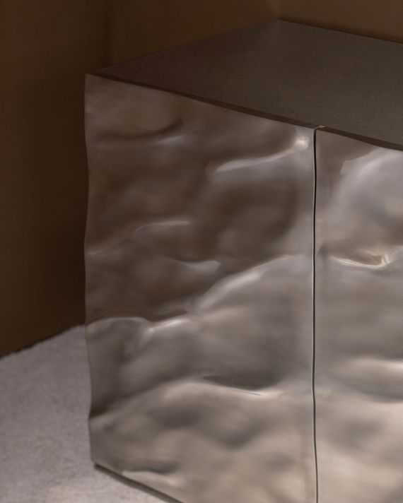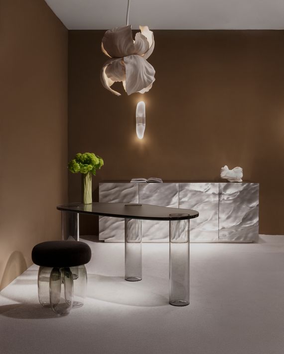 Mathieu Lehanneur, who designed the 2024 Paris Olympics torch, is known for his material experimentation, treatments that create the illusion of other elements. In his own booth at the fair, the French designer debuted new pieces in wood, ceramics, glass, and metal. With its ripplelike outer shell, the cast metal Balcony Sideboard translates how waves form and move across bodies of water into solid form. Not just pearlescent, its sculpted surface catches the light and creates dramatic shadows.