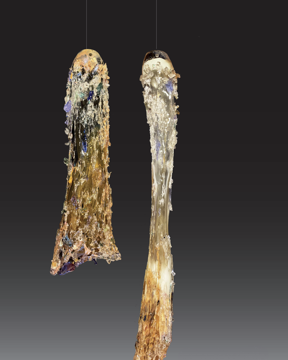 Dutch artist Maarten Vrolijk’s Sakura pendants at Todd Merrill Studio are glass vessels that shimmer due to the jewel-toned fragments that cling to them. Rolled into the especially thick base forms when they’re still in a semi-liquid state, these shattered elements engage light in many directions. A gold-foil-covered wall accentuated the new designs’ luminescence.