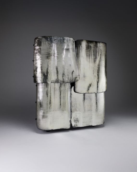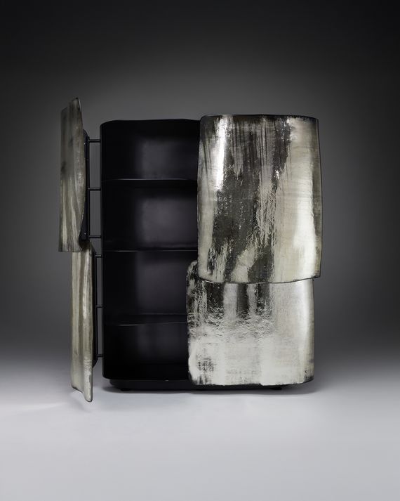 Presented by London’s Charles Burnand Gallery in what was arguably the fair’s best booth, JG Neukomm’s Abditio Cabinet is an armoire with four mirrored glass doors that fold over each other like artichoke petals. But to call them “mirrored” is an oversimplification; this isn’t an ’80s artifact, but something that looks much more organic. The glass layered over the mirrored sheets is uneven and bubbly, causing them to shift between transparency and opacity. Behind the doors, the body of the cabinet is a somber blackened steel, highlighting the contrast between its weighty core and the lightness of its outer shell.