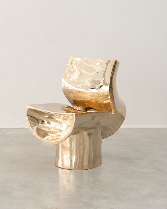 Also at Gallery FUMI, Greek designer duo Voukenas Petrides’s Split Tube Chair gleamed from the floor. The chair, forged entirely out of bronze, doesn’t look at all like the precious metal, since it’s been polished to the point of being fully reflective. As the name suggests, the form is suggestive of a peeled, divided cylinder: both delicate and incredibly hardy. But like a lot of the pieces at Salon, these are not precision, machine-turned surfaces; the designers left folds and small curves in the surfaces, which reflect the light in multiple directions.