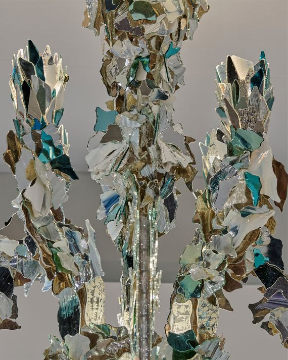Taking pride of place in New York–based Twenty First Gallery’s display, French designer Nathalie Ziegler’s Milano Chandelier diffuses light through its many iridescent and sandblasted glass elements. Loosely reflecting the contour of an elaborate neoclassical pendant lamp that one might expect to find in the Hall of Mirrors at Versailles, the almost pixel-like form is very much the sum of its parts. The interlocking and overlapping pieces were first handblown and then meticulously cut to form before being collaged together.