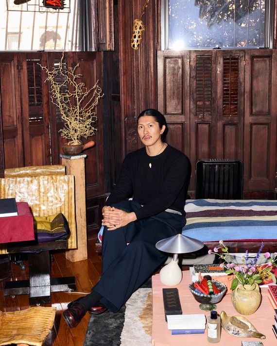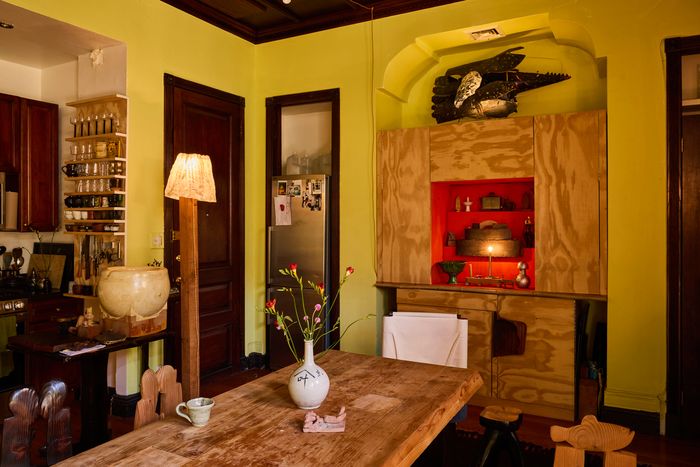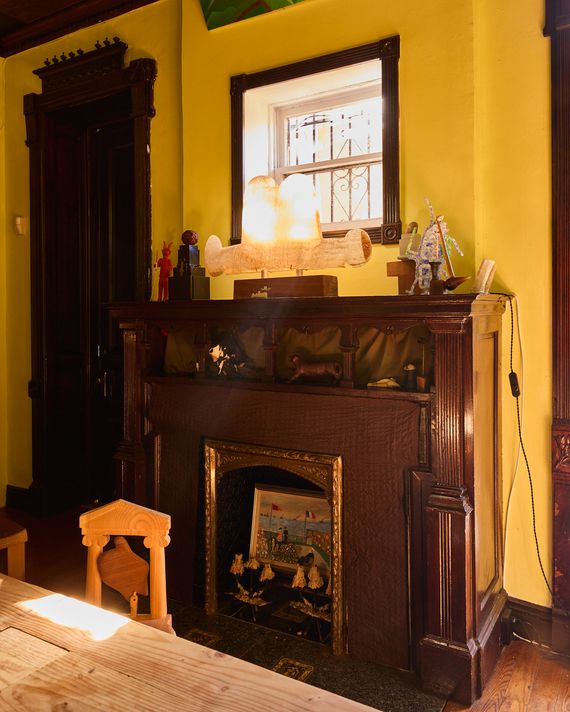 “I was looking for old architecture,” Kim says. He found it in a prewar building in Bedford-Stuyvesant with coffered ceilings and original moldings and shutters. The parlor-floor unit, which features an original, elaborately carved wooden mantelpiece, became a period backdrop for his hypermodern aesthetic. He painted the walls green, which can read yellow depending on the light.