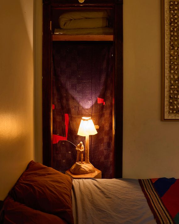 The Bedroom “I found the lamp with the sculpted figure, which I later altered to look like myself,” Kim said of the fisherman lamp. The art to the right is “Work 9711” by Lee.