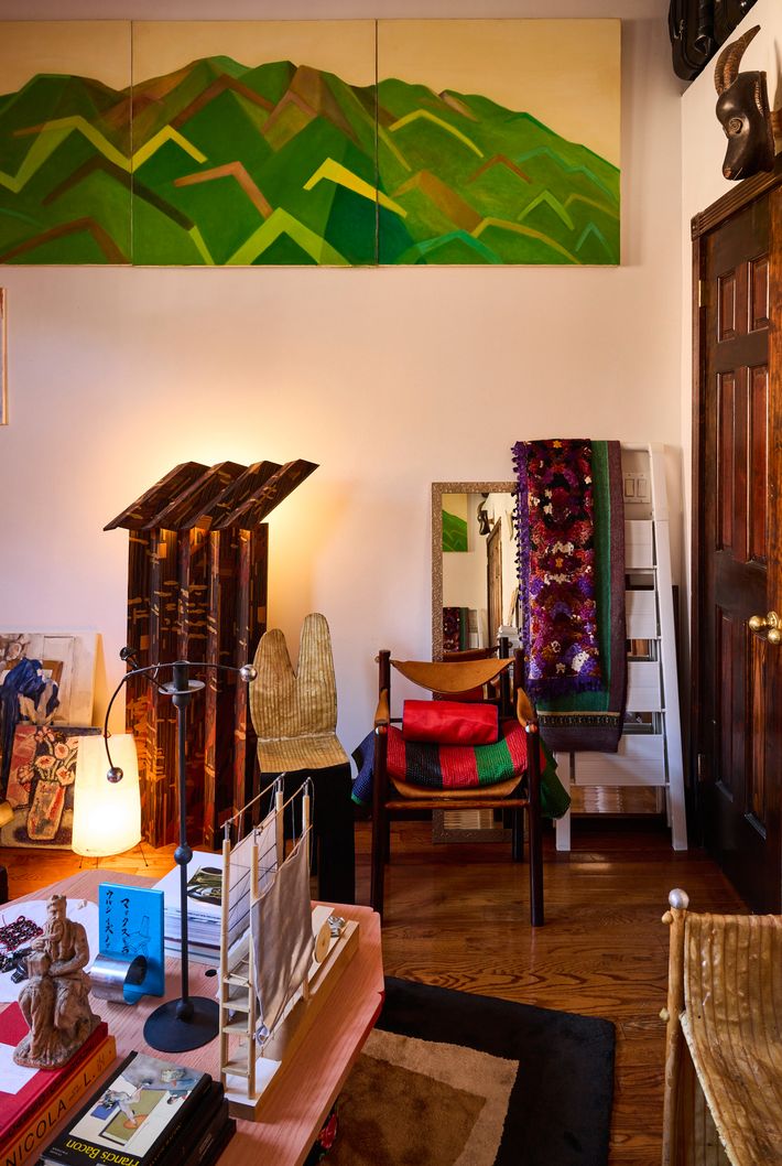 The Living Room The large oil on canvas, Ideal Landspace, is by Lee. Kim designed the Lola chair, seen in front of the Accordion lamp, by Shaina Tabak.